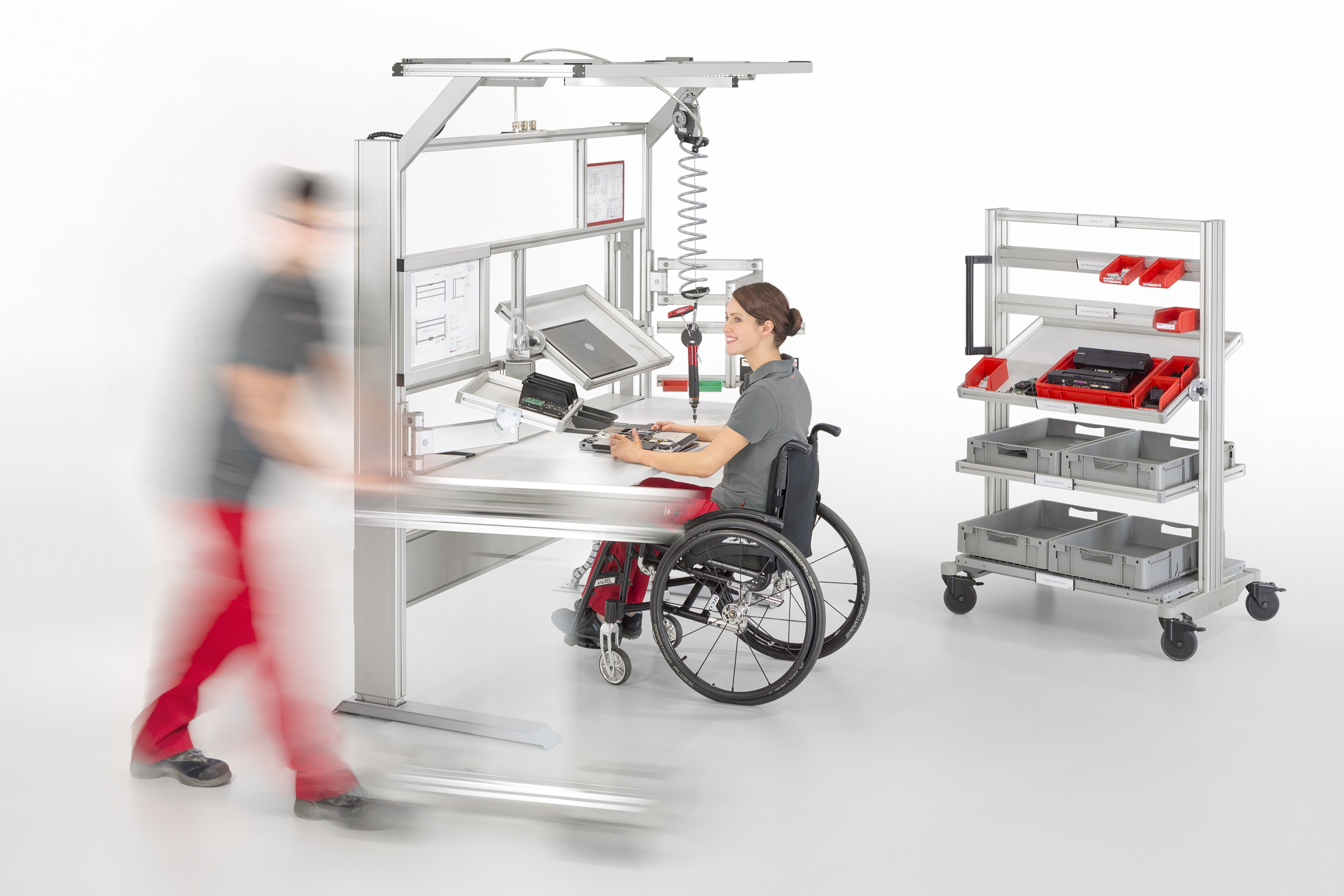 To establish a disabled-friendly workspace, it is important to ascertain employees’ precise requirements, as each impairment gives rise to specific needs. Businesses can create customised solutions using a wide range of suitable products in the item portfolio. Wheelchair users and people with difficulties sitting or walking are often unable to reach very far. In most cases, they cannot bend down or reach for objects that are further than arm’s length away. “That is why all required work equipment, such as tools and components, needs to be placed in the immediate handling area,” recommends Geibel. Multiaxial pivot arms, for example, ensure material supply and picking can be customised to the individual. Needs-based, mobile parts supply using height-adjustable parts containers that are positioned in easy reach of staff also makes it easier for workers with disabilities to lay their hands on the tools and materials they need. To extend the radius of the worker’s reach, it should also be possible to get a wheelchair right underneath the work bench. “Conventional work benches don’t allow that. The solution, however, is simple. C-shaped benches ensure that equipment offers maximum legroom,” explains Geibel. To minimise physical strain, work benches need to be ergonomically height-adjustable and thus allow workers to easily adopt the perfect sitting or standing position. To avoid poor posture, chairs and footrests also need to be customised to the employee and the task at hand. If employees have problems with moving, they need anti-slip surfaces to ensure workpieces stay in place. Workers with visual impairments, on the other hand, require surfaces that differ as much as possible from each other – something otherwise best avoided. In addition, visually impaired employees need significantly stronger lighting than their co-workers.